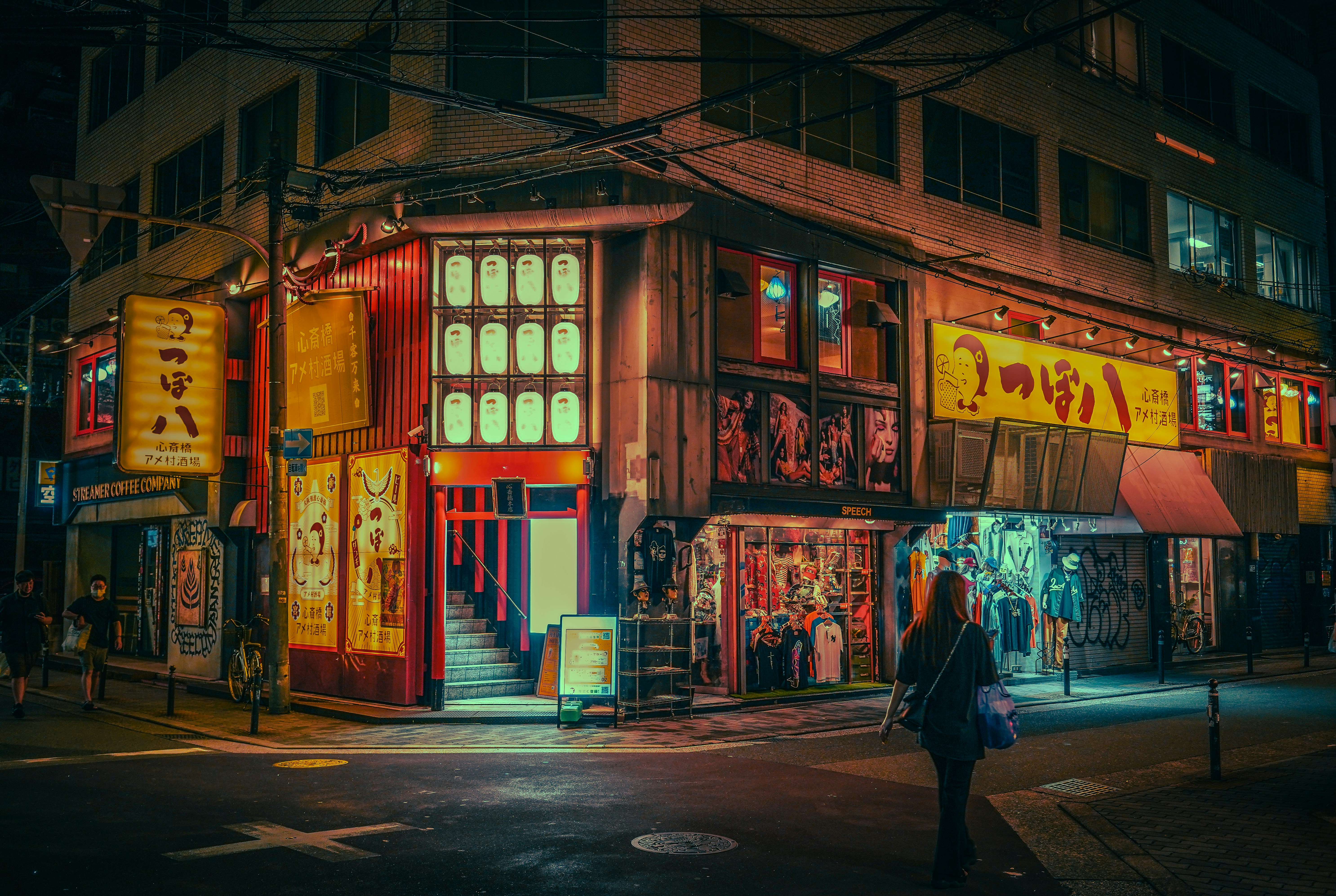 Stores faint under the lamps’ erratic yellowness.