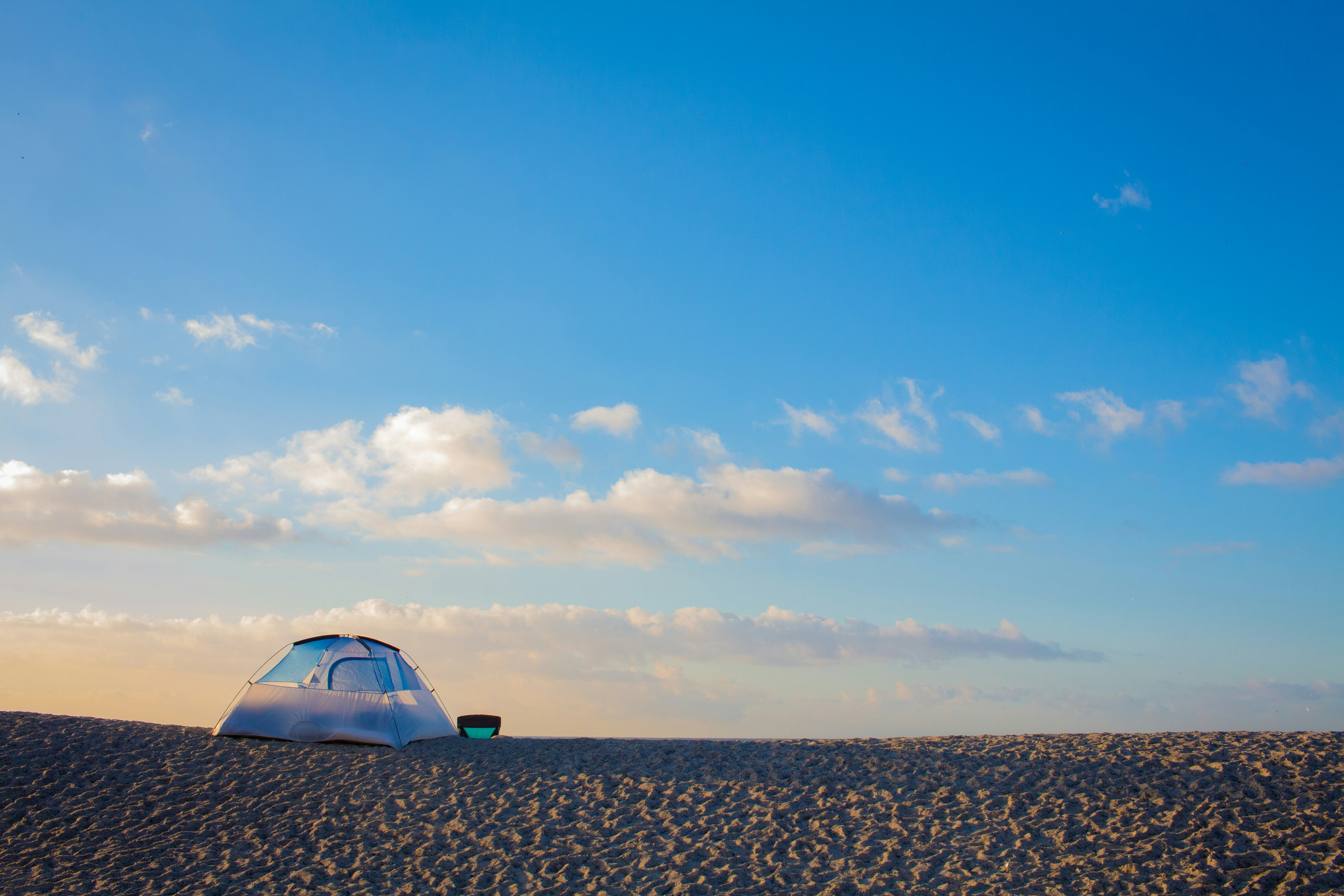 Our caving blue beach tent, her fingers brushing the sanding floor.